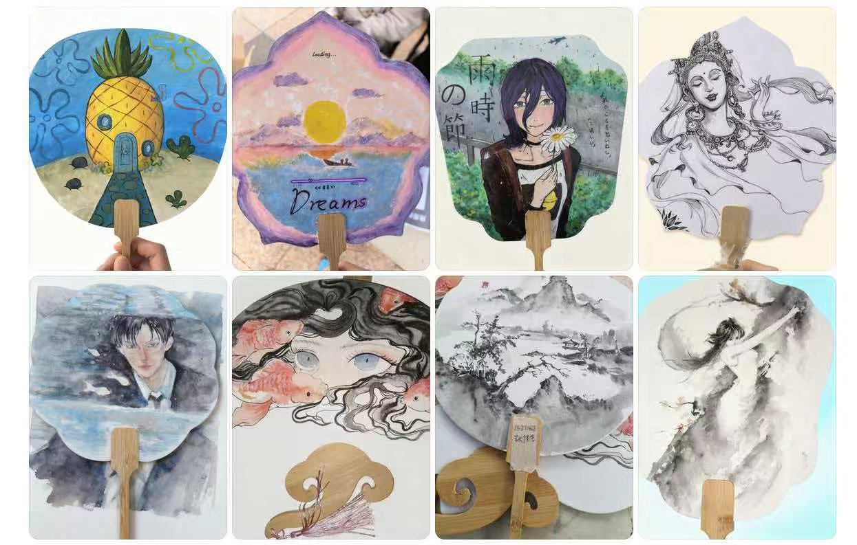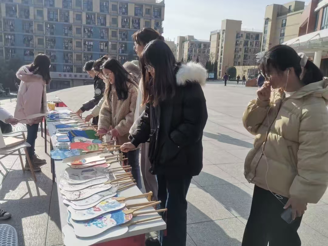 活动筹备阶段,主办方分工明确、筹备充分。创作期间,参赛同学热情高涨、巧思迸发。大家于指定时间领取统一采购的纸扇材料后,充分发挥专业特长与创意灵感,以水粉、丙烯、马克笔等多样画材为媒介,在扇面上勾勒灵动线条、晕染绚烂色彩,将青春创意与人文关怀融入每一幅作品。公益拍卖现场吸引过往师生及校外游客纷纷驻足,为公益助力。