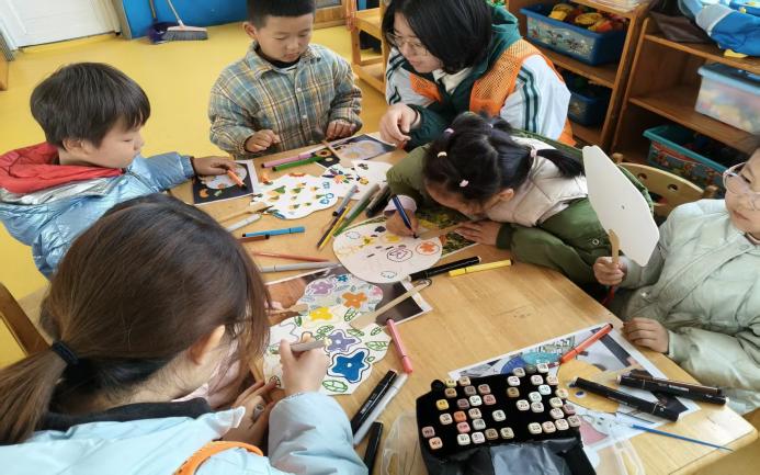 活动现场,志愿者提前准备了空白纸扇、水彩笔、油画棒等绘画工具,分组陪伴孩子们围坐创作。志愿者们耐心引导,从扇面构图到色彩搭配,带领小朋友逐步完成线条勾勒与填色。孩子们充分发挥想象力,在扇面上绘制出小动物、花草以及卡通形象等童趣画面,原本空白的纸扇在互动中变得色彩斑斓。志愿者与孩子们不时交流,倾听他们的创作想法,现场气氛温馨活跃。